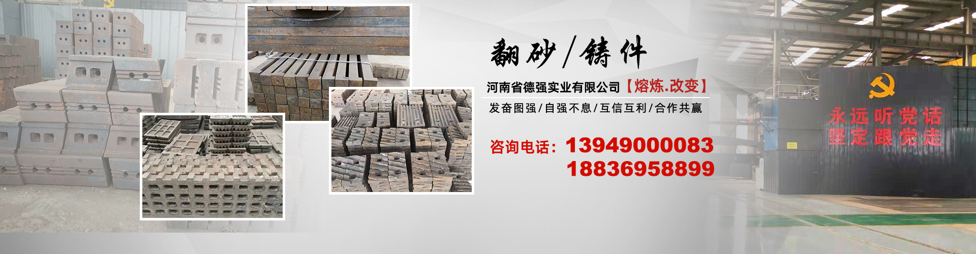河南省德強(qiáng)實(shí)業(yè)有限公司專(zhuān)業(yè)鑄造板錘、高鉻板錘、破碎機(jī)板錘、反擊破板錘、細(xì)碎機(jī)錘頭、制砂機(jī)錘頭、粉碎機(jī)錘頭、球磨機(jī)襯板、鋼球、鋼段、顎式破碎機(jī)鄂板(牙板、齒板),邊護(hù)板(叉板)、肘板、對(duì)輥破碎機(jī)(雙輥破碎機(jī))輥皮、輥殼、雷蒙磨配件(磨輥磨環(huán))等礦山配件,還可根據(jù)客戶(hù)需要定制各種耐磨鑄件,鑄鋼件,灰鐵鑄件、生鐵鑄件歡迎來(lái)電來(lái)函咨詢(xún)! 我廠(chǎng)生產(chǎn)的板錘、錘頭、球磨機(jī)襯板、鋼球、鋼段、顎式破碎機(jī)鄂板(牙板、齒板),邊護(hù)板(叉板)、肘板、對(duì)輥破碎機(jī)(雙輥破碎機(jī))輥皮、輥殼、襯板、雷蒙磨配件磨輥磨環(huán)等礦山配件,廣泛用于冶金、建材、礦山、電力、化工行業(yè)。其中采用的雙金屬材料連續(xù)澆注一次鑄造成型技術(shù),替代現(xiàn)有市場(chǎng)上錘柄、錘頭二次鑄造的工藝,使錘柄錘頭不斷裂。